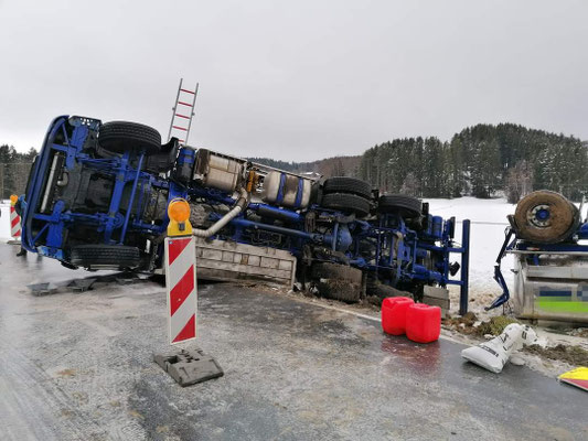 Ein Milchlaster kam von der Straße ab und lag auf der Seite, bzw. der Anhänger auf dem Dach.